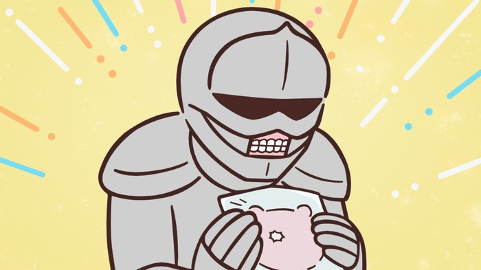 「鎧さん」と呼ばれる鎧をまとった種族の一人。銀〜グレーの鎧に、ピンクの手作りポシェットを身につけているのがトレードマーク。少しのんびりした話し方が特徴で、優しい雰囲気を醸し出しています。