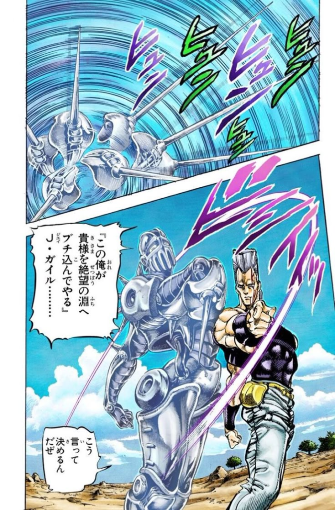 暗殺チームとの戦闘ではその根性と戦闘センスを活かし活躍しましたが、時を飛ばす能力を持つディアボロの「キング・クリムゾン」には歯が立たず、無念の敗北を喫しています。中~遠距離戦に特化した、頼れるが限界もあるスタンド使いです。