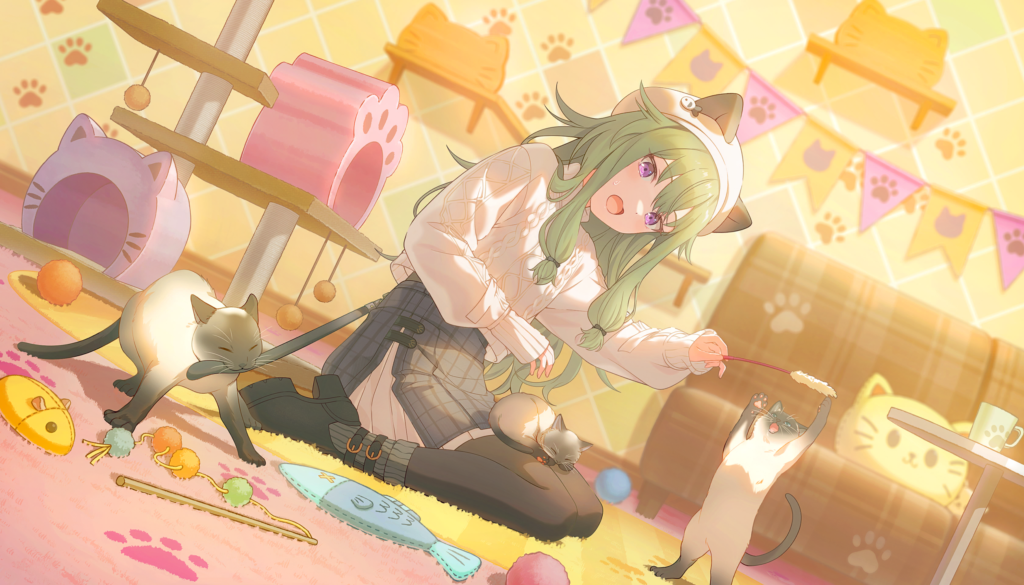 猫みたいなつり目、つい撫でたくようなふわふわな緑髪、可憐で清楚な服装も似合っていて歌姫の名に恥じないキュートなビジュアルになっています。