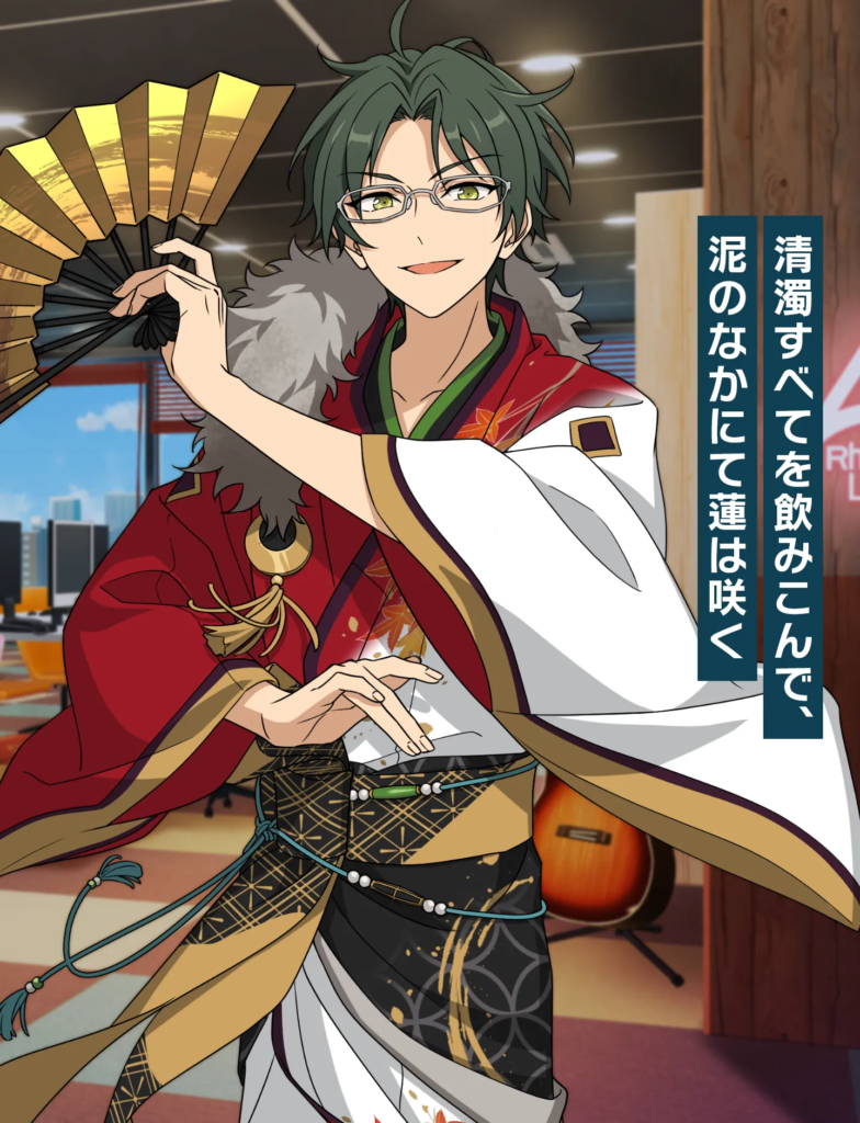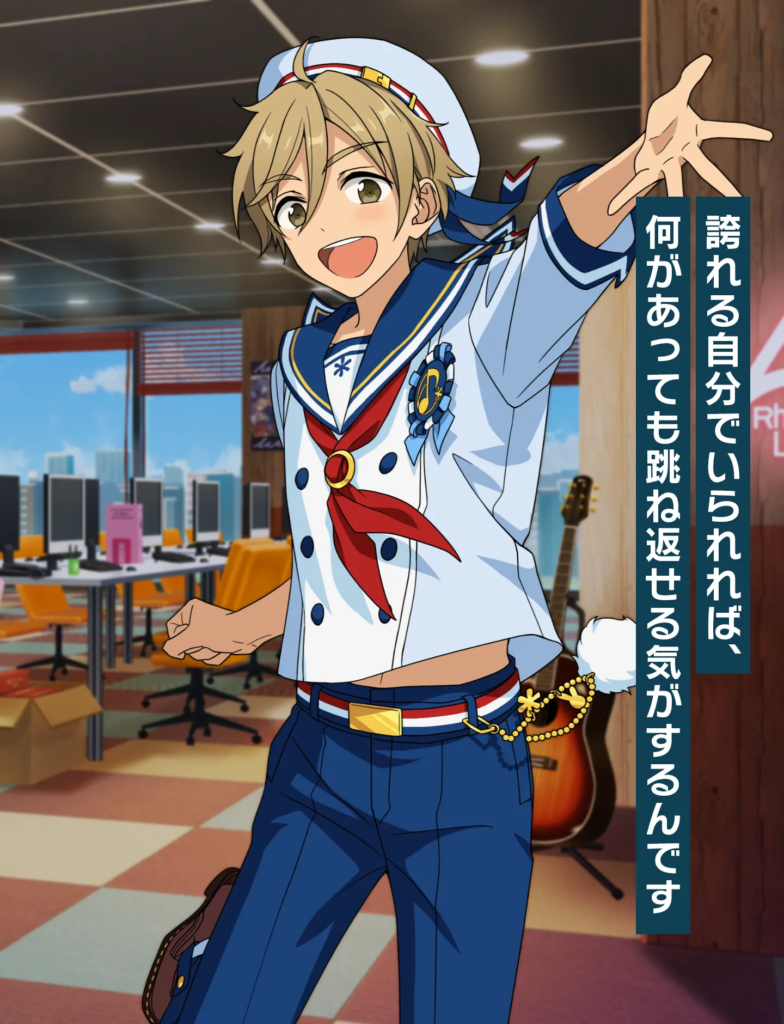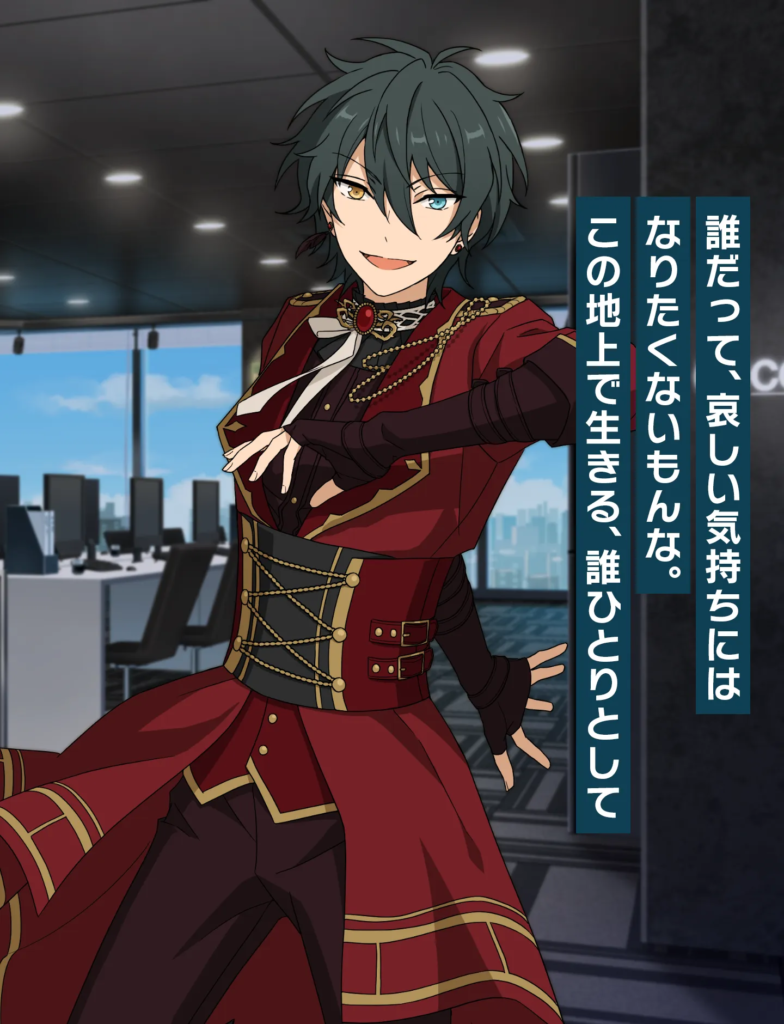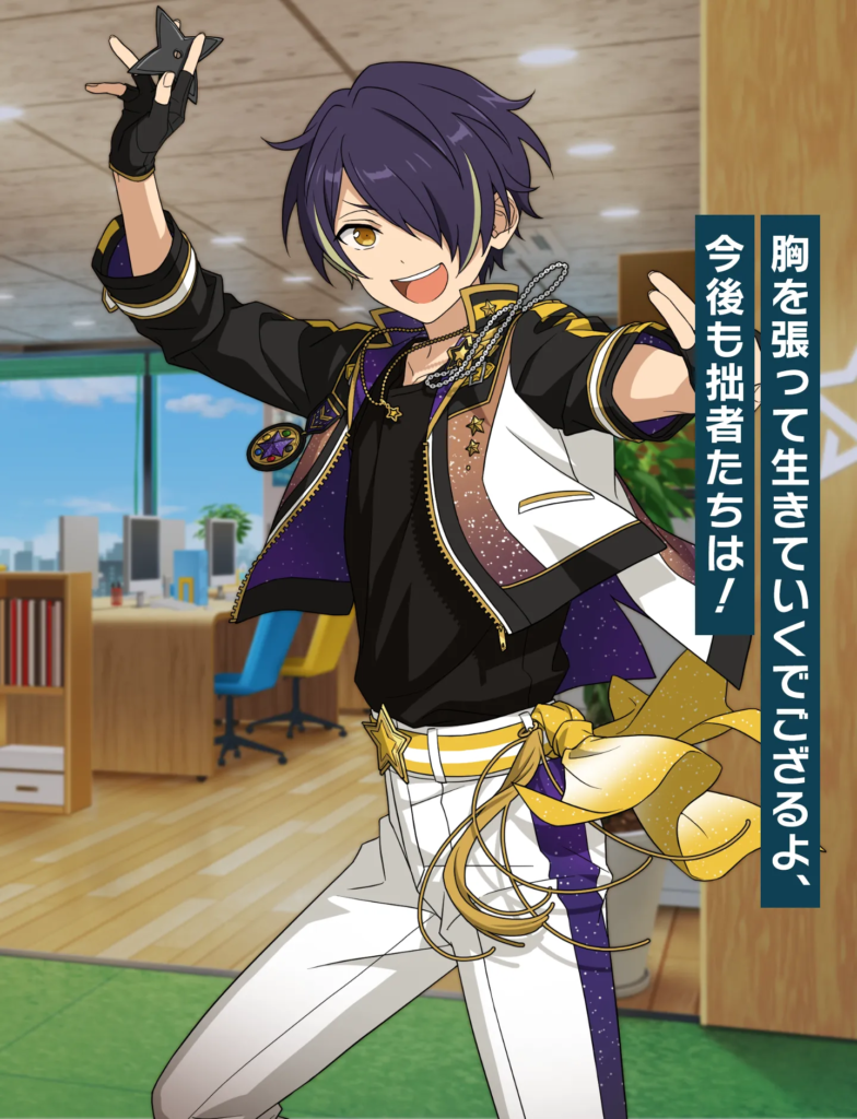 学生時代から努力を積み重ね、自らチャンスを掴んできた根っからの努力家。見た目には少し刺々しさもありますが、礼儀作法はしっかり身についており、ユニット「Eve」の相方・巴日和にはつい悪態をつきながらも、揺るぎない信頼関係を築いています。