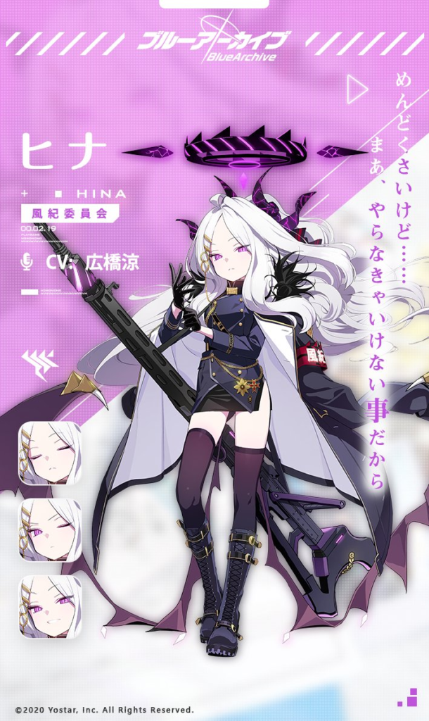 眠たげな表情でアンニュイな雰囲気を漂わせるクールビューティー。しかしその裏では、風紀委員会のメンバー、とくにヒナのことを深く考える不器用な優しさを持っています。