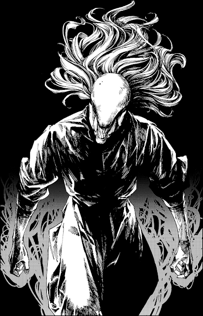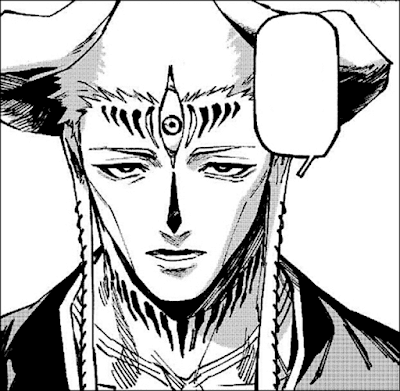 五条悟や宿儺に匹敵する長身に、一対の大きな角、胸元まで垂れる長い耳朶、そして額に備わった三つ目の目が外見上の特徴。