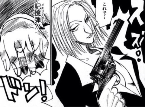 念能力「記憶の探索(サイコメトリー)」は、対象に触れることで深層記憶を読み取る能力で、「記憶の弾丸(メモリーボム)」ではその記憶を弾丸として他者に撃ち込み、共有することができます。