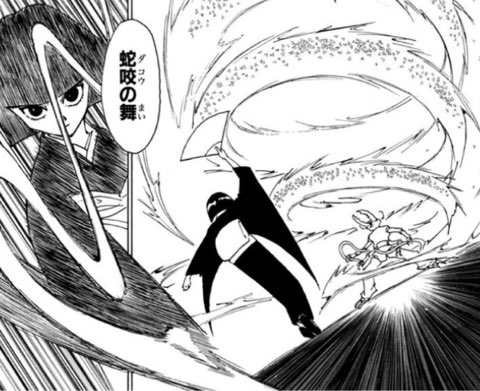 念能力「紙吹雪(カミフブキ)」および「蛇咬の舞(ジャコウノマイ)」では、扇子を用いて紙片を自在に操り、敵対者に付着させた紙を起点に紙の蛇による攻撃を集中させます。これにより兵隊蟻を難なく撃破しました!