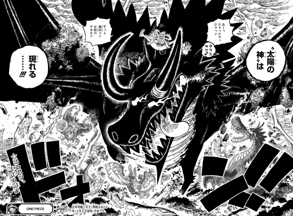 第1174話では、ギア5で巨大化したルフィが相対的に小さく見えるほどのスケール感が描かれており、ファンの間では「カイドウの龍形態をさらに上回る」「島を覆う規模」と評されることもあります。