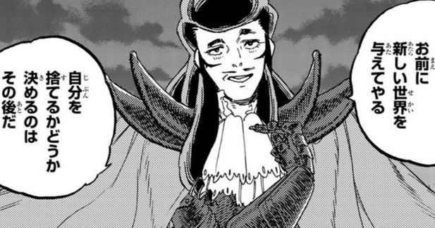 黒いローブをまとい、物語序盤ではナレーションのように存在していた“観察者”。やがて実体を現し、フシへ助言を与える存在として姿を見せます。