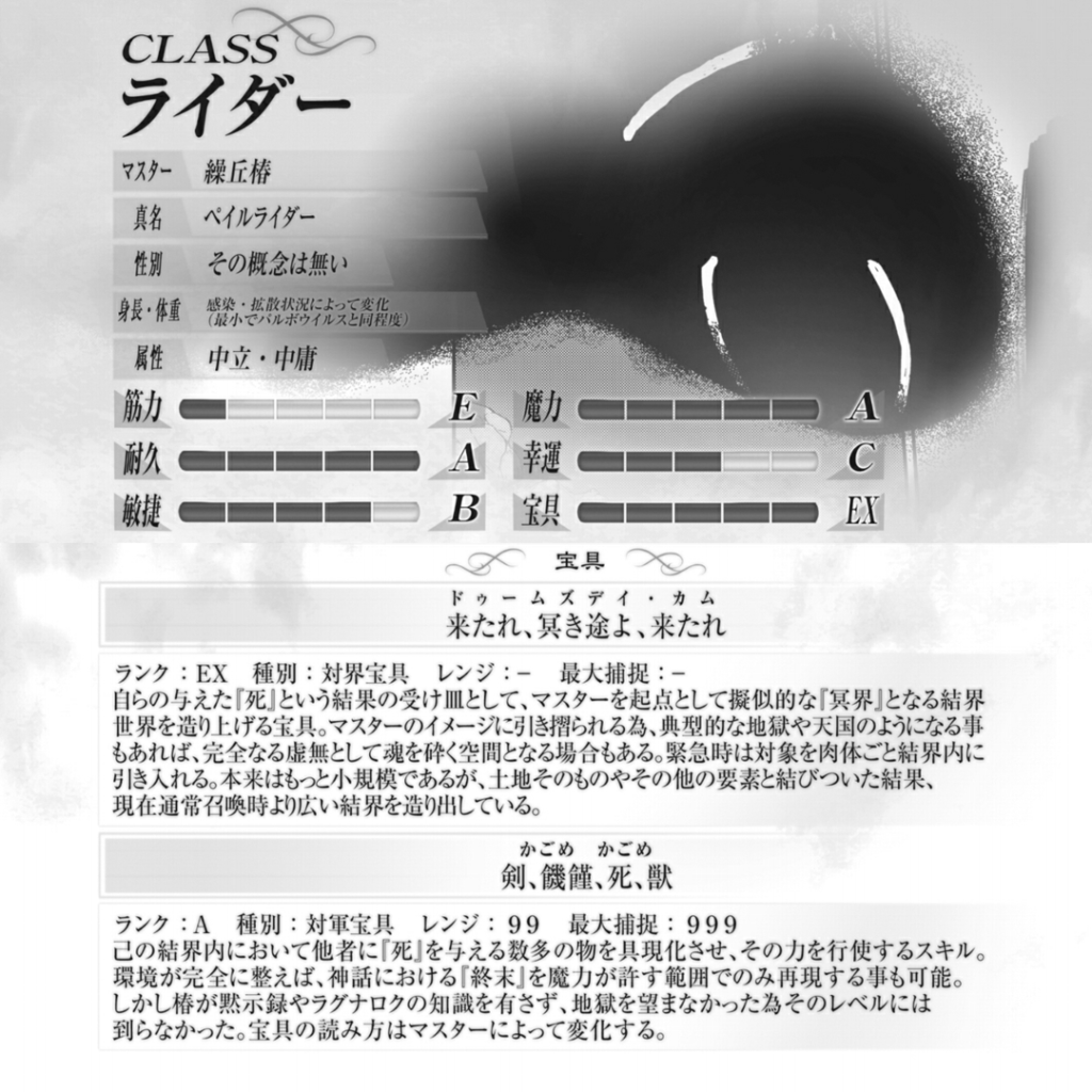 まず、椿は昏睡状態のまま無意識にサーヴァントであるライダー――ペイルライダーを召喚し、偽りの聖杯戦争の最初の参加者となりました。